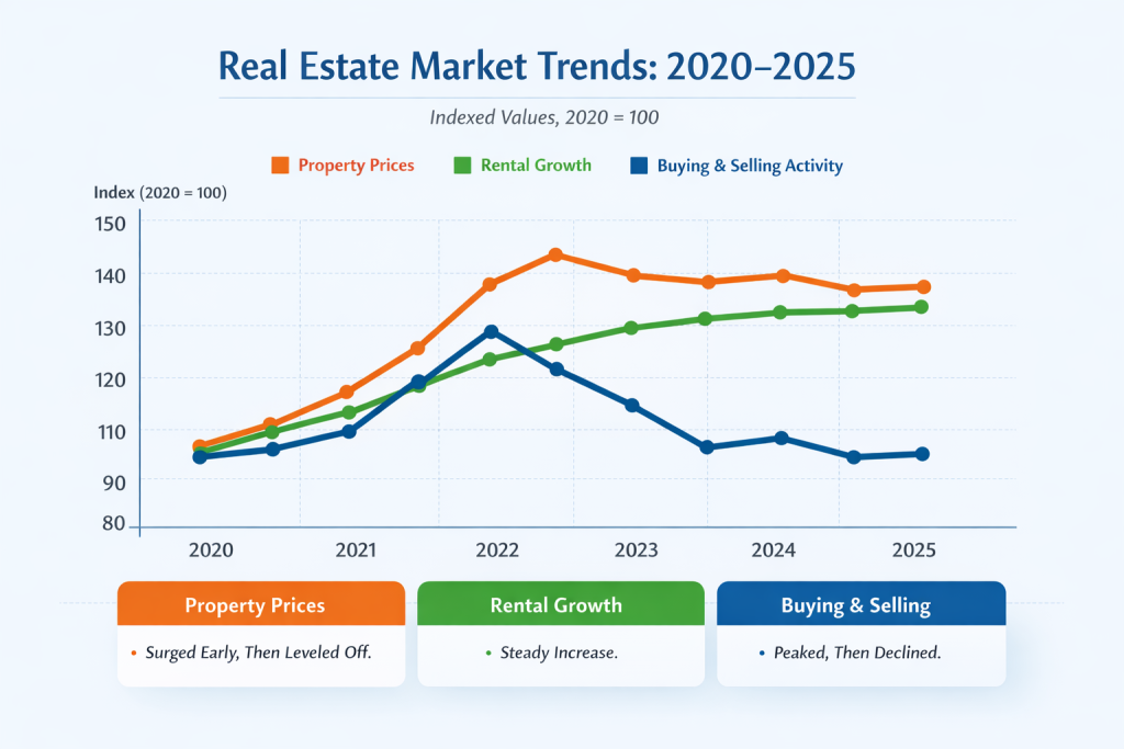 From 2020 to 2025, global real estate transitioned from rapid post-pandemic expansion to a phase of normalization. Prices surged first, rentals followed steadily, and transaction volumes cooled — creating a more selective, yield-focused investment landscape.